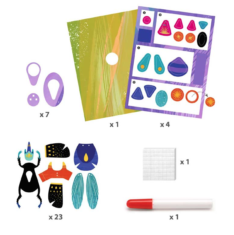 Conținut: 4 plăci de carton ilustrate (15 x 20 cm), bucăți de carton ondulat, 23 de bucăți de hârtie, 1 coală de autocolante, 1 coală de adezivi din spumă cu două fețe, 1 tub de lipici, 1 broșură explicativă pas cu pas în culoare.