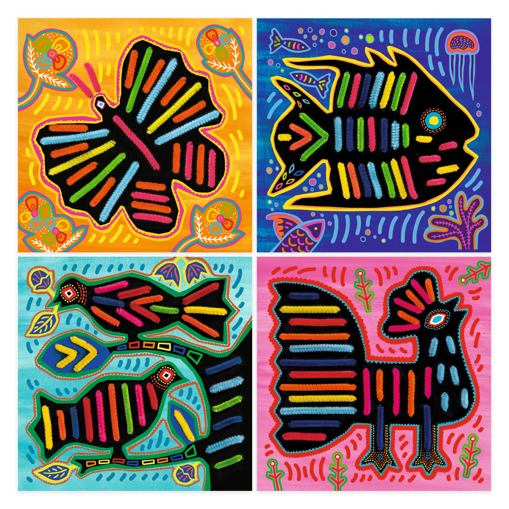 Urmând instrucțiunile furnizate, copiii trec sârmele plușate colorate prin găurile trasate pe cele patru tablouri. Aceasta activitate este inspirată din arta Kuna din America de Sud.
