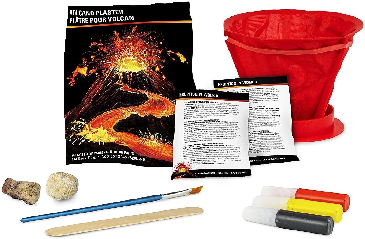 Conține: ipsos, matriță vulcanică, vopsele și pensulă, pulbere de erupție, două specimene de rocă vulcanică (geodă și piatră ponce) și ghid de învățare.