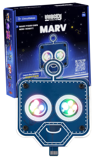 Deschide cutia robotelului Marv, un robot DIY, si exploreaza diferitele componente electronice, impreuna cu modul de functionare al contorului de decenii si al butoanelor sale. In cele din urma, vei crea un robot intrigant care se aprinde.