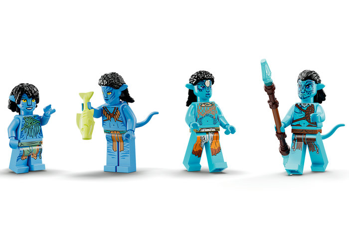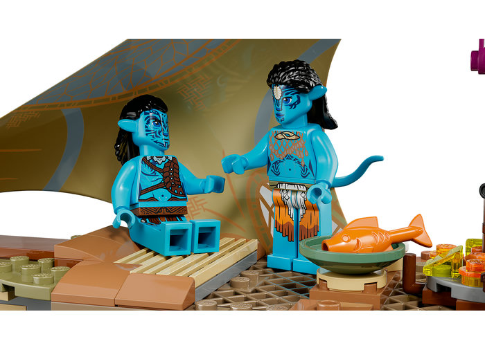 - Ce este în cutie? – Include o casă din satul Metkayina, cu detalii din filmul Avatar: Calea apei, plus o canoe, un decor cu corali de pe Pandora și minifigurinele Neytiri, Kiri, Ronal și Tonowari