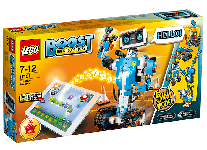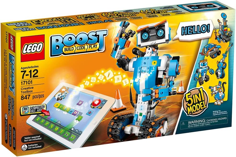 Amplifica-ti experienta de constructie LEGO cu uimitoarea "Cutie creativa de unelte LEGO BOOST". Construieste-l si personalizeaza-l pe Vernie, propriul tau prieten robot vorbitor, codifica-i comportamentul si realizeaza activitati distractive cu suportul de joc inclus. Vorbeste-i lui Vernie, iar el va raspunde cu expresii faciale ce reflecta dispozitia lui. Vernie se misca in toate directiile, cu viteza variabila, pe senilele lui mari, vede obiecte si culori, sesizeaza distanta, apuca si transporta accesorii, face gesturi cu mana si lanseaza sageti din lansatorul montat pe umarul sau! De asemenea, Vernie sesizeaza si reactioneaza la socuri, si isi da seama cand il ridici. Reconstruieste-l pe Vernie pentru a crea M.T.R.4 (Roverul multifunctional 4), Guitar4000, Frankie the Cat sau AutoBuilder, toate controlate de la tableta ta cu aplicatia gratuita descarcabila, care include si instructiuni digitale de constructie LEGO pentru toate cele 5 modelele, plus activitati si idei care-ti stimuleaza imaginatia.