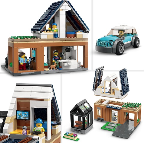 Setul 6+ LEGO® City Casa de familie si masina electrica (60398) contine camere combinabile, inclusiv o sera cu o zona de dining, o bucatarie, 2 dormitoare si o baie. Casa mai are si un punct de incarcare pentru masina electrica si panouri solare si include o Placa de drum LEGO pentru conectarea cu alte seturi din gama LEGO City. Nu trebuie decat sa adaugi cele 3 minifigurine si figurina catel pentru multe ore de joaca fantezista in casa.