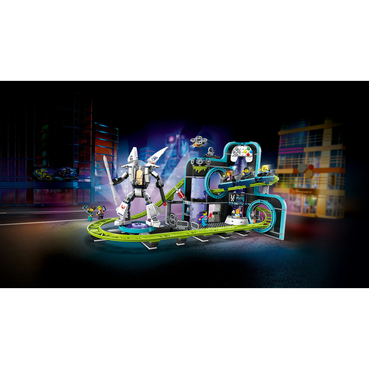 Copiii care îndrăgesc jocurile video şi jucăriile pe tema parcurilor de distracţii vor adora acest set cu roller-coaster complet funcţional. Jucăria de aventură LEGO® City Parc cu roller-coaster Lumea Roboţilor (60421) este plină de detalii care să inspire ore întregi de joacă fantezistă. Copiii pot lansa cu viteză trenul cu 3 vagoane printr-o zonă futuristă din jocul video, care găzduieşte o sală de jocuri video cu console specifice, o arenă e-sport, un bar de granita şi multe altele. Setul include şi un costum de robot articulat şi 8 minifigurine pentru joacă pe roluri şi poveşti.