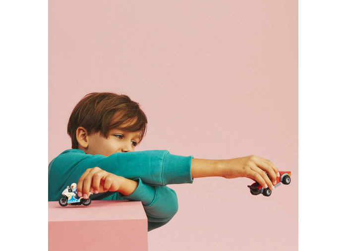 - Ce este în cutie? – Include tot ce au nevoie copiii pentru a construi o motocicletă de poliție pentru urmărire și o mașină sport pentru evadarea infractorului, precum și minifigurine polițist și infractor