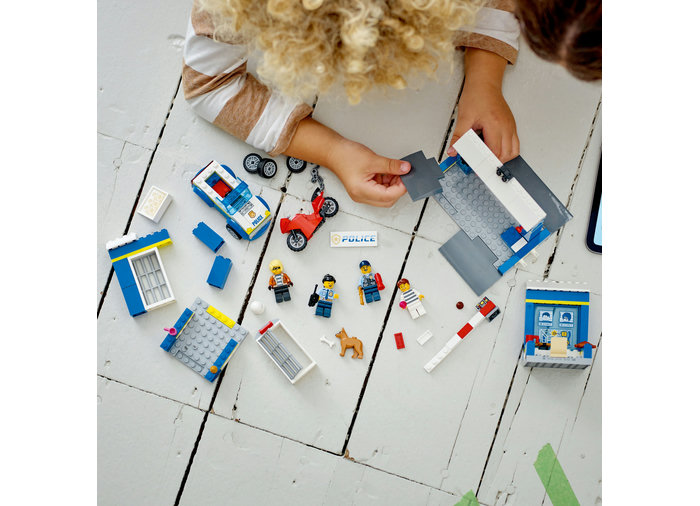 - Ce este în cutie? – Tot ce au nevoie copiii pentru a construi o secție de poliție, o mașină de poliție și o motocicletă a infractorului, precum și 2 minifigurine agent de poliție și 2 minifigurine infractor și o figurină câine polițist