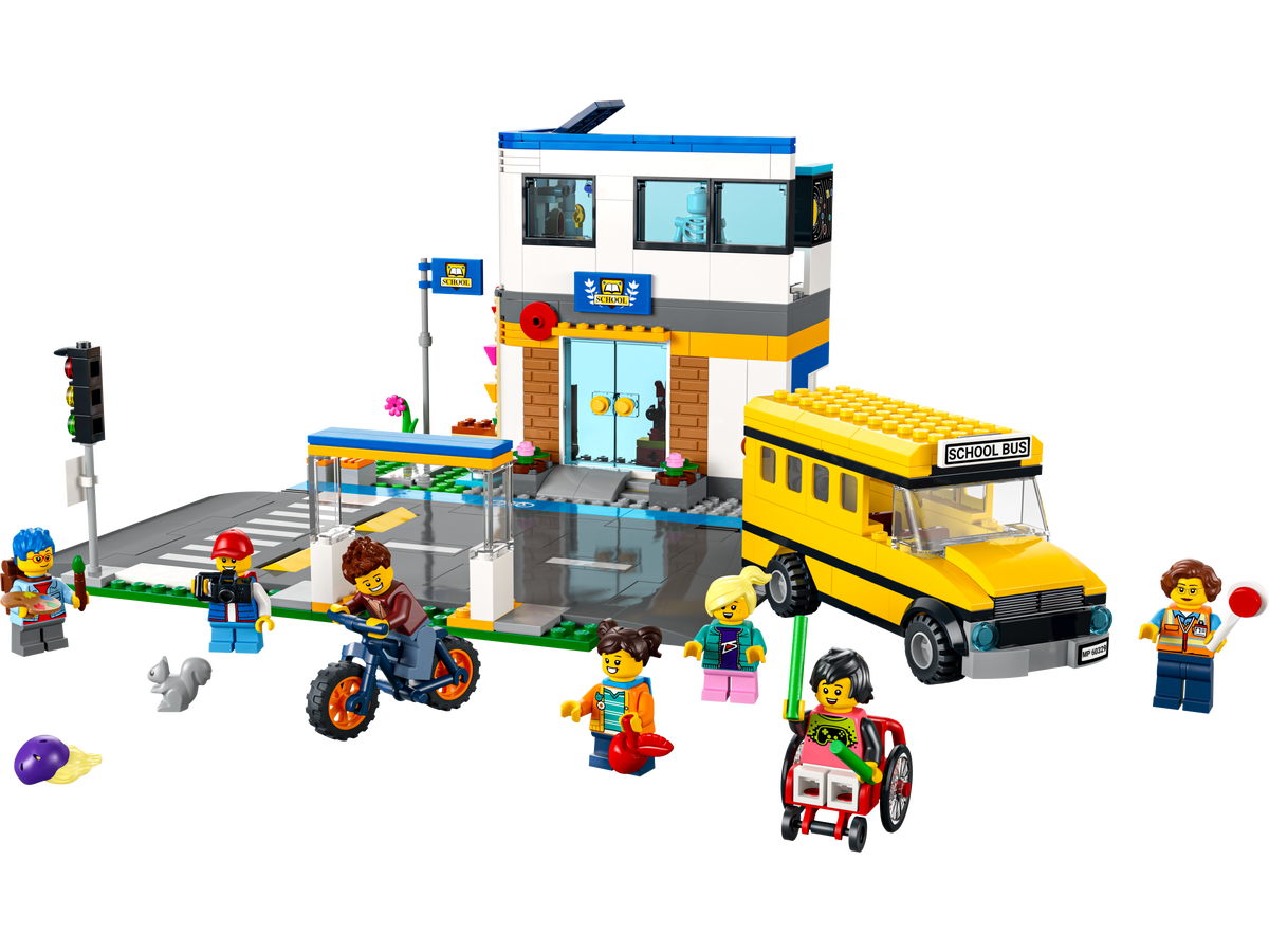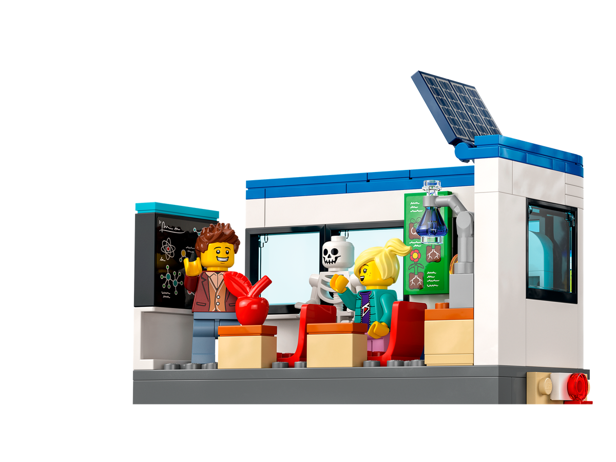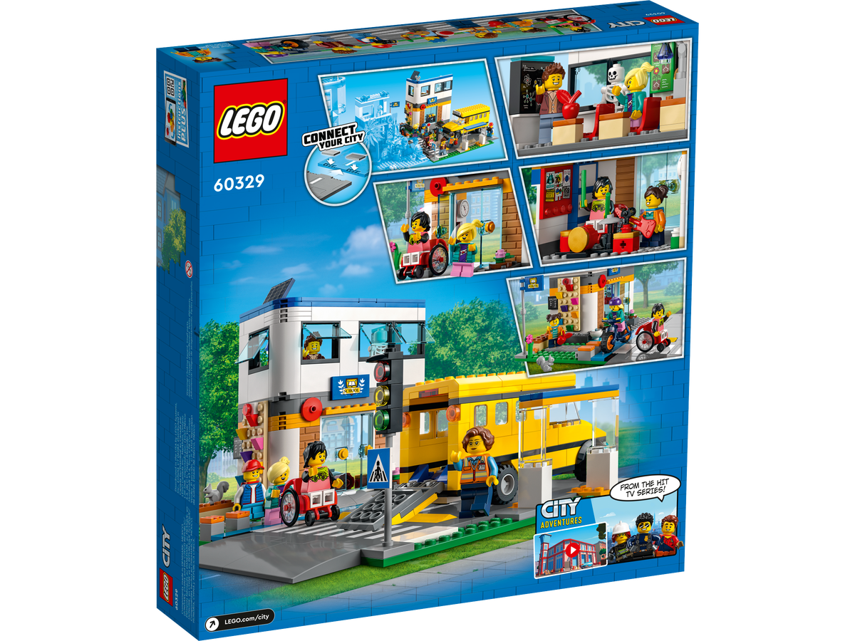 Cu acest set de joc LEGO® City Zi de școală (60329), având 2 săli de clasă și o curte cu perete de escaladă și șotron, plus jucării autobuz școlar și bicicletă te așteaptă aventuri pasionante la școală. Plăcile de drum, cu trecere de pietoni și pistă de biciclete, pot fi folosite pentru a conecta setul la alte seturi LEGO, iar cu cele 7 minifigurine, inclusiv 2 personaje din serialul TV LEGO City Adventures, există inspirație din plin pentru joacă fantezistă.