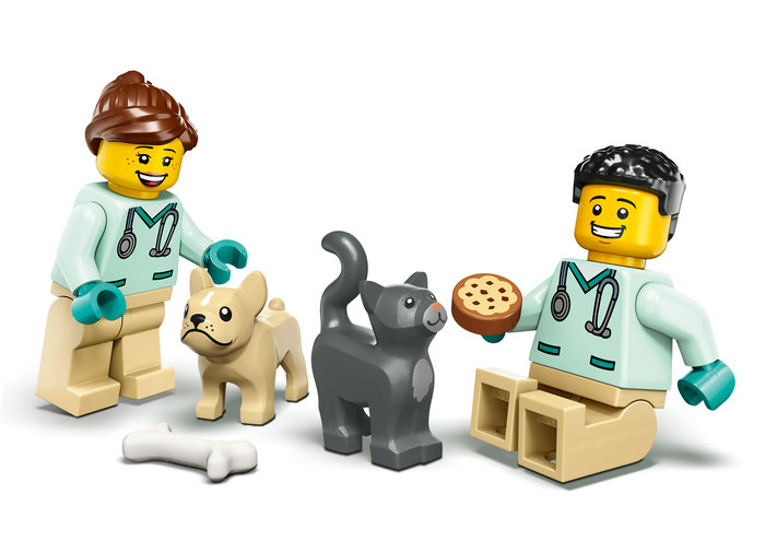 - Joacă fantezistă – Copiii le pot ajuta pe animalele suferinde să se așeze pe targă,pentru ca apoi minifigurinele veterinari să urce la volan și să se îndrepte spre cea mai apropiată clinică veterinară