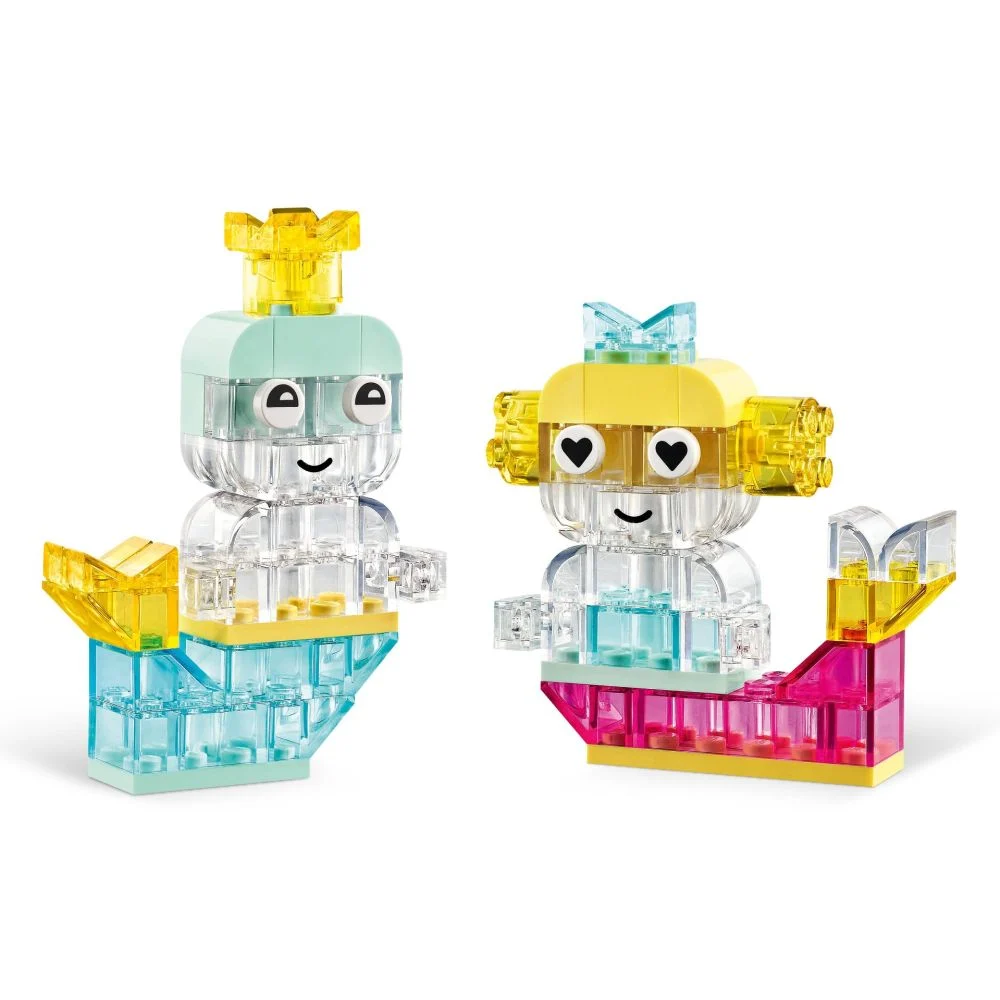 Copiii incep prin a construi o inima, o fantoma, o sirena, o stea si un unicorn. Pe masura ce increderea lor creste, pot asambla o nava spatiala, un nor, o stea cazatoare, o pasare, un narval, o inghetata si o floare. Apoi, pot extinde distractia creativa cu un castel mare si un dragon. Caramizile transparente, piesele care afiseaza ochi si guri si caramizile cu agatatoare pentru etalare aduc stralucire si distractie creativa suplimentara in creatiile copiilor.