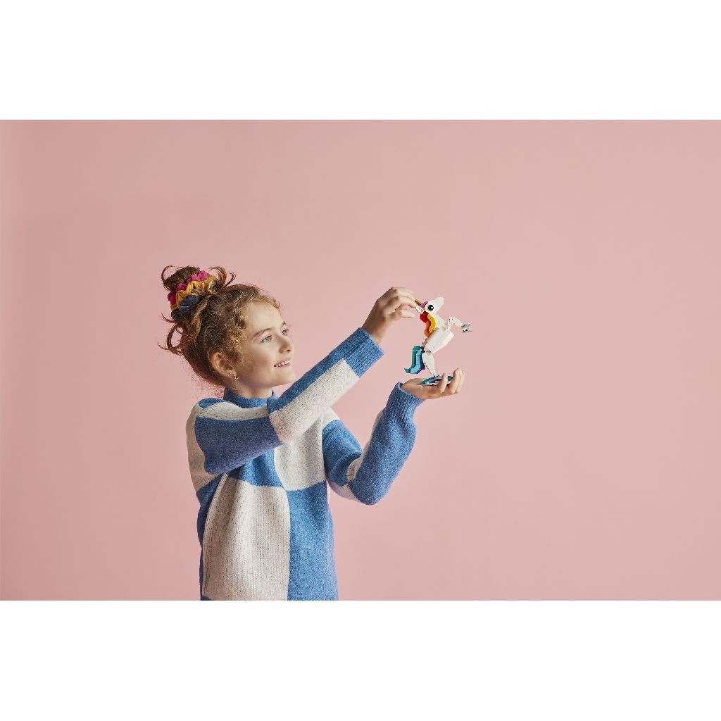 Copiii creativi in varsta de 7+ ani pot fi transportati intr-un taram mitic cu actiune palpitanta cu acest set de construit 3-in-1 Unicorn magic (31140). Contine un unicorn de jucarie cu un corn aurit, o coada colorata si picioare si copite articulate. Poate fi prezentat in 2 pozitii diferite: stand pe 4 picioare sau ridicat pe cele 2 picioare din spate si expus pe stativul curcubeu.