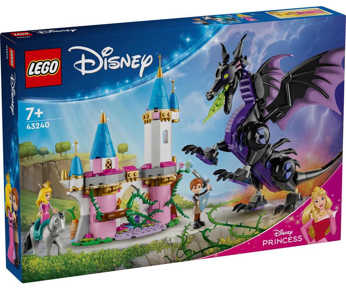 Poveşti impresionante îi aşteaptă pe copii şi pe fanii de 7+ ani ai producţiei Disney Frumoasa adormită pe când creează setul LEGO® Disney Princess Maleficent sub formă de dragon (43240). Setul de construcţie este o idee grozavă de cadou Disney şi are o secţiune de pod cu turnuri şi spaţiu pentru un pat, o roată care se învârte şi alte elemente iniţiatoare ale jocului. În set se află figurinele minipăpuşi LEGO Disney Aurora şi Prinţul Phillip, o figurină cal LEGO Disney Samson şi o figurină LEGO Disney dragon, cu cap, picioare şi coadă mobile şi cu aripi pliabile.