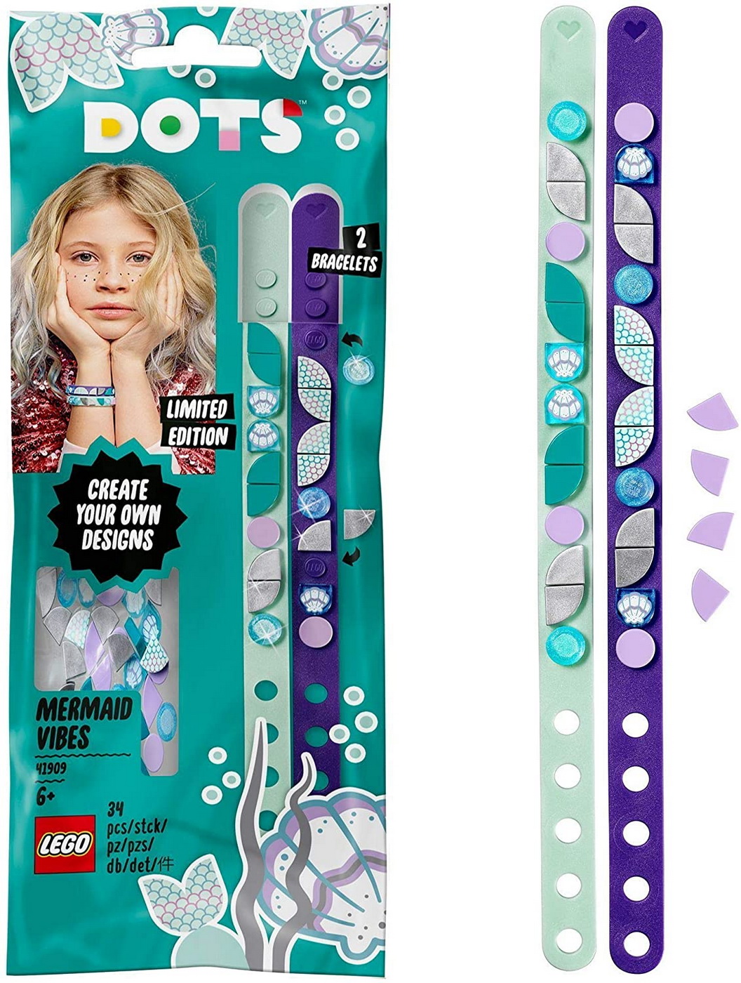Micii fani ai sirenelor vor adora sa creeze, sa poarte sau sa imparta cu prietenii cei mai buni acest set de Bratari Fantezii marine LEGO DOTS (41909)! Gandit sa fie un proiect artizanal usor si intuitiv, acest set de bratari de bricolaj incurajeaza copiii sa creeze accesorii impreuna cu prietenii. Ei le pot remodela apoi asa cum doresc. Bratari simpatice de bricolaj personalizate Acest set de confectionat bratari are 2 benzi reglabile cu un singur rand de culoare mov inchis si albastru verzui, ce se potrivesc pe incheieturile mai mari sau mai mici. Setul are de asemenea 32 de placute asortate, inclusiv placute translucide cu sclipici si placute speciale decorate, plus idei de design pe ambalaj pentru a incuraja copiii iubitori de lucru manual sa se apuce de treaba. Accesorii pentru micile sirene creative Bucuria acestui set artizanal este ocazia copiilor de a decora bratarile de bricolaj asa cum doresc, si de a le imparti apoi cu prietenii. Ei le pot amesteca si potrivi cu modelele prietenilor pentru a fi cu adevarat unice, deoarece orice se potriveste cu aceste bratari! Acest set este un cadou minunat de Craciun, de zi de nastere sau oricand.