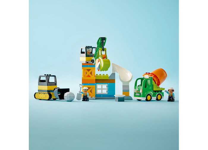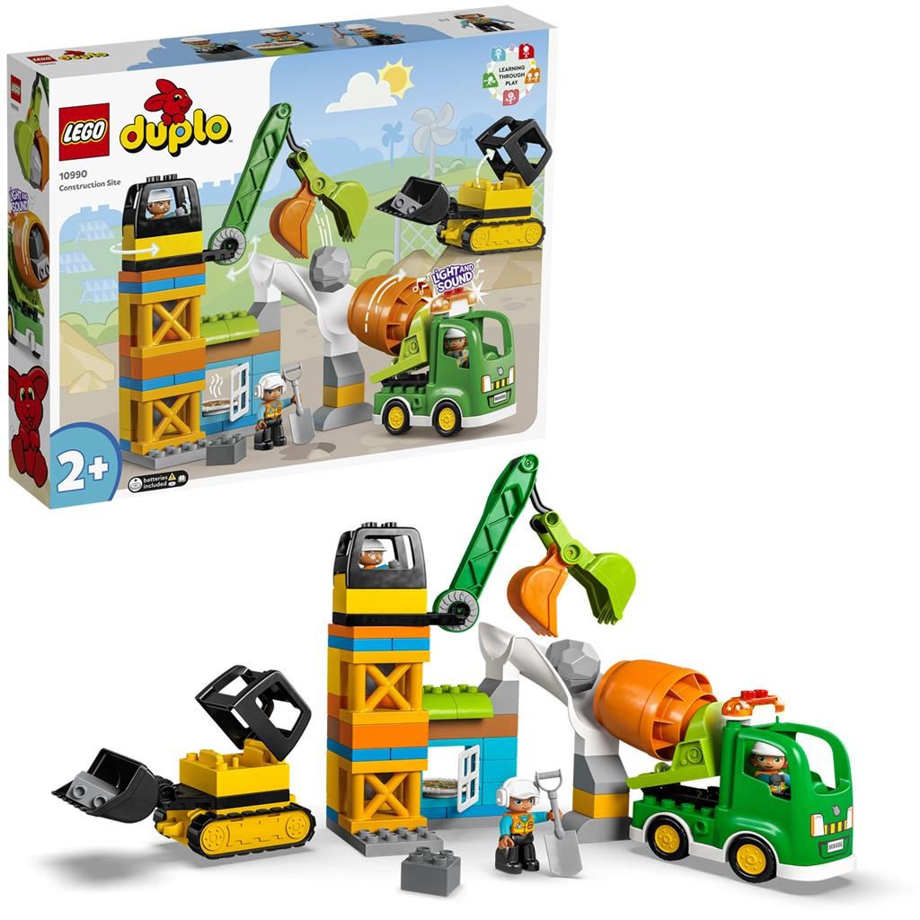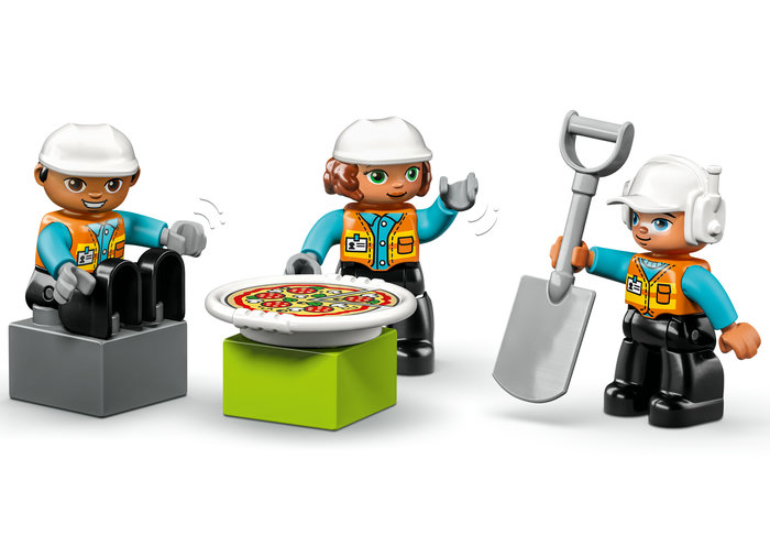 Pune bazele unor solide abilităţi de construcţie cu setul LEGO® DUPLO® Town şantierul (10990). Plin de dotări, acesta conţine detalii care inspiră joaca pe roluri şi ajută la dezvoltarea exprimării de sine. Copii de 2+ ani învaţă despre munca în echipă pe măsură ce trioul de muncitori constructori operează cele 3 vehicule. Buldozerul cară bolovanul, iar macaraua îl apucă şi-l transportă la tobogan, de unde alunecă în betonieră. Când munca se încheie, muncitorii sunt răsplătiţi cu o pizza gustoasă pentru treaba bine făcută.