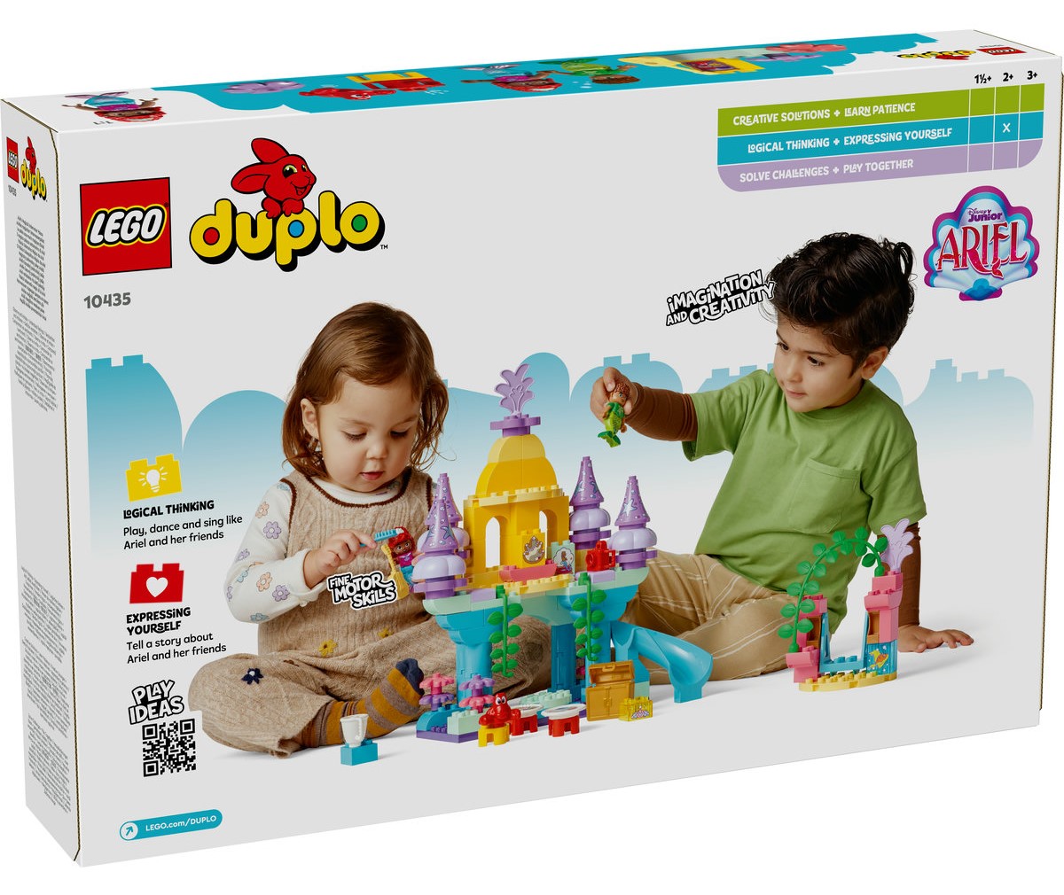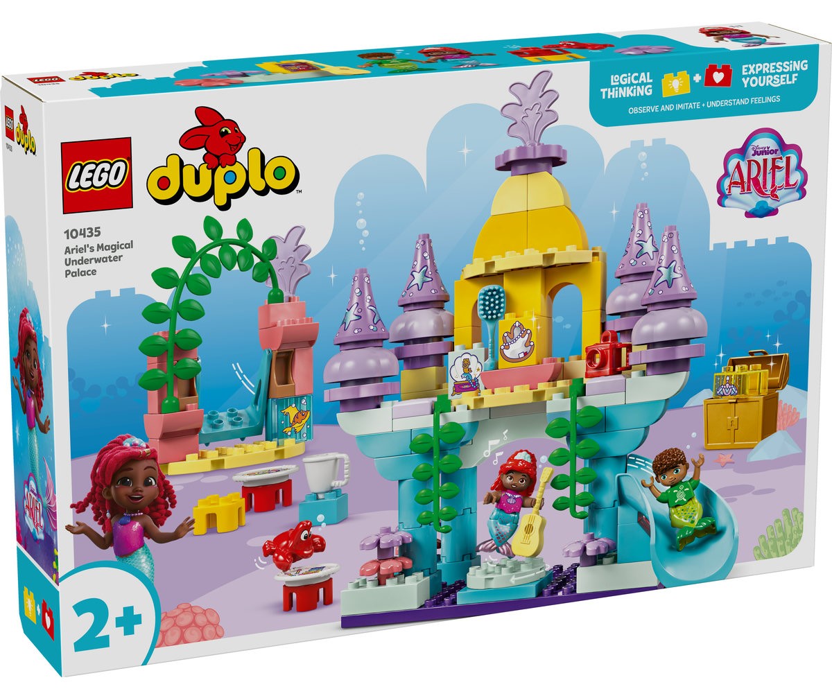 Cei mici ajută figurina LEGO DUPLO Prinţesa Disney Ariel să se pregătească în camera ei. Aceasta vine apoi pe ringul de dans, unde Fernie şi Sebastian cântă la instrumente muzicale. Acestea sunt doar câteva dintre multele accesorii care-i inspiră pe cei mici să inventeze poveşti despre Ariel şi prietenii săi. Prin intrarea în pielea personajelor, copiii explorează cum se construiesc relaţiile. Această jucărie educativă şi de construcţie dezvoltă totodată dexteritatea micuţilor pe când aceştia rotesc ringul de dans şi împing leagănul mobil.