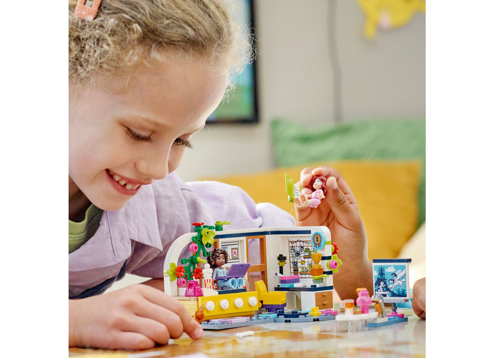 Copiii de 6+ ani pot crea propriile povești amuzante cu setul de construcție LEGO® Friends Camera Aliyei (41740). Sunt multe de explorat în vreme ce Paisley și Aliya scriu povești împreună înainte să se culce. Camera reflectă firea studioasă a Aliyei, cu accesorii precum lucrări de școală, un scaun pivotant, un laptop, o carte, o lampă și un trofeu. Copiii vor adora detaliile suplimentare, cum ar fi lucrarea notată cu 4 pe care Aliya a ascuns-o sub teancul de lucrări de nota 10! Poate Paisley opoate învăța pe Aliya să nu mai fie atât de autocritică. Când e vremea pentru relaxare, există un mare ecran pentru filme și accesorii pentru momentele de joacă cu cățelușa Aliyei.