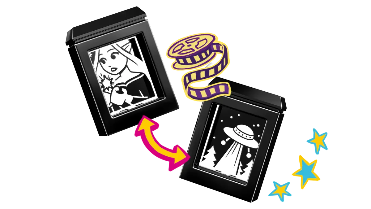 „Lumini, cameră, prietenie!”! Copiii au ocazia să spună povestea prietenelor Paisley și Aliya care se bucură de o seară de film în grădina lui Paisley.Introdu un diapozitiv de film în proiector și apasă cărămida luminoasă pentru a face imaginea să apară pe ecranul mare. Descoperă o mulțime de accesorii, între care un aparat de popcorn cu un mâner pentru a face floricelele să sară! Alte accesorii includ o cutie pentru popcorn, băuturi, o carte de benzi desenate și 2 fotolii confortabile.