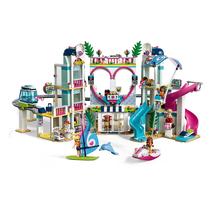 Aluneca in viteza in ocean pe toboganele din parcul acvatic din Statiunea din Heartlake 41347 LEGO® Friends si evita galetile ce improasca apa cand se rastoarna! Fa windsurf sau sari pe scuterul de apa si trage-o pe Andrea cu parasuta pentru o priveliste uimitoare a plajei.