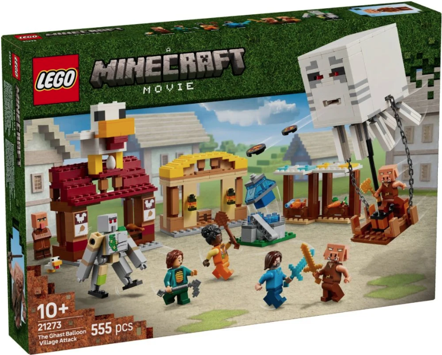Setul include personaje populare din jocul video: Steve, Natalie, Dawn, 2 piglini, un balon ghast, un satean, un puisor si o figurina golem de fier articulata. Balonul are spatiu pentru piglini si contine un lansator de discuri. In sat se afla tarabe de piata, restaurantul de pui prajit al lui Steve, coliba sa de artizanat si o fantana, pe care copiii o pot face sa „explodeze” folosind o functie incorporata. Acoperisul restaurantului este acoperit cu un model mare reprezentand un pui, care include o functie amuzanta de depunere de oua. Pentru distractie digitala, aplicatia LEGO Builder le permite copiilor sa apropie, sa roteasca modelele in 3D si sa isi urmareasca progresul.