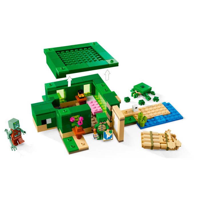 Acest model de casă LEGO în formă de broasca țestoasă Minecraft este plin în interior și în exterior cu acțiune Minecraft și distracție cu animale. Cu 3 personaje emblematice Minecraft și o structură grozavă de construit, jucăria de construcție LEGO Minecraft The Turtle Beach House (21254) este o idee grozavă de cadou pentru băieții și fetele de peste 8 ani. Jucătorii construiesc o casă de jucărie Minecraft în formă de broască țestoasă, cu ferestre, felinare, o ușă, un pat, o masă, o masă de lucru și un cuptor. Un acoperiș cu ridicare oferă acces ușor la interior. În afara casei de jucărie cu broaște țestoasă există o zonă de plajă cu trestie de zahăr, ouă de broaște țestoasă și o plută de bambus cu vâsle. Există figuri și mulțimi familiare Minecraft: un Războinic din piele țestoasă în piele și cască de țestoasă, un înecat cu un trident, o țestoasă care ronțăie iarbă de mare și 3 jucării cu animale de țestoasă. Alte accesorii din acest cadou pentru jucători includ o lunetă și o hartă. Fanii acțiunii jocurilor, construcțiilor creative și îngrijirii animalelor vor adora această jucărie versatilă. Pentru distracție digitală suplimentară, aplicația LEGO Builder permite constructorilor să mărească, să rotească modelele în 3D și să urmărească progresul lor.