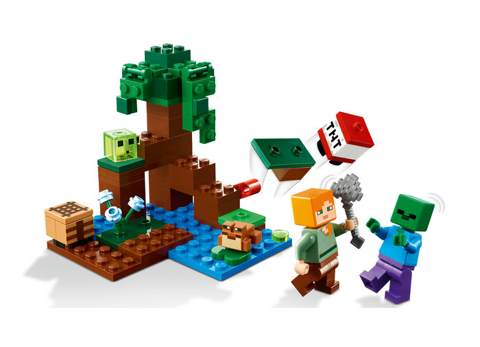 Așază emoțiile creative din Minecraft în mâinile copiilor cu versiunea fizică a periculosului biom al mlaștinii. Această jucărie adaptabilă o include pe Alex, personaj cunoscut și îndrăgit din Minecraft, care se aventurează prin nămol și printre mangrove. Pe lângă oportunitățile de a construi creativ, setul include și 2 mobi ostili cu care să te lupți, un zombi și un slime, precum și o broască prietenoasă care observă acțiunea de pe o frunză de nufăr. Copiii o ajută pe Alex să-și folosească toporul și să apese un mâner ca să detoneze TNT pentru a se apăra de orice atac. Pentru mai multă distracție digitală, aplicația LEGO Builder oferă instrumente intuitive de zoom și rotire care permit copiilor să-și vizualizeze modelul în timp ce-l construiesc.