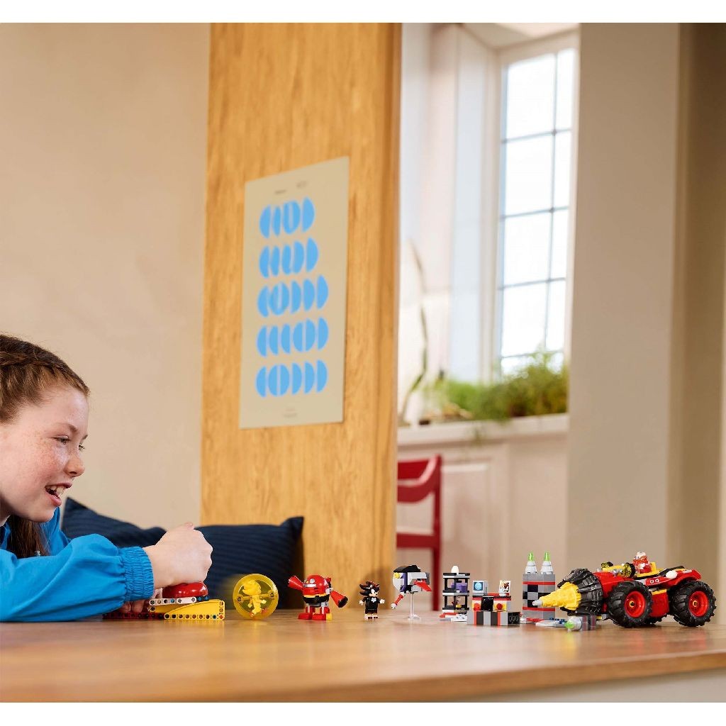 Acest cadou LEGO® Sonic the Hedgehog™ de colecţie, inspirat de jocurile video, include un vehicul Egg Drillster cu burghiu rotativ şi un doc pentru vehiculul planor detaşabil, un lansator de sfere de viteză şi o sferă de viteză, plus un laborator cu un perete care se sparge. De asemenea, setul include 7 personaje din jocurile video: Shadow, Super Sonic, Dr. Eggman, un Pocky, un Pecky, un Egg Pawn Badnik şi un Gun Wing +u201ereprogramat+u201d.