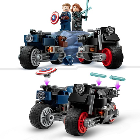 Minifigurinele Capitanul America si Black Widow calatoresc pe motocicletele vazute in premiera in memorabilul film Razbunatorii: Sub semnul lui Ultron, creat de Marvel Studios in 2015. Ambele motociclete sunt dotate cu arme laterale si suporturi pentru bastonul lui Black Widow si scutul Capitanului America. Minifigurinele sunt usor de desprins de pe motociclete pentru a extinde si mai mult posibilitatile de joaca. Pentru mai multa distractie digitala, constructorii pot apropia si roti seturile in 3D si-si pot monitoriza progresul cu ajutorul aplicatiei interesante si intuitive LEGO.