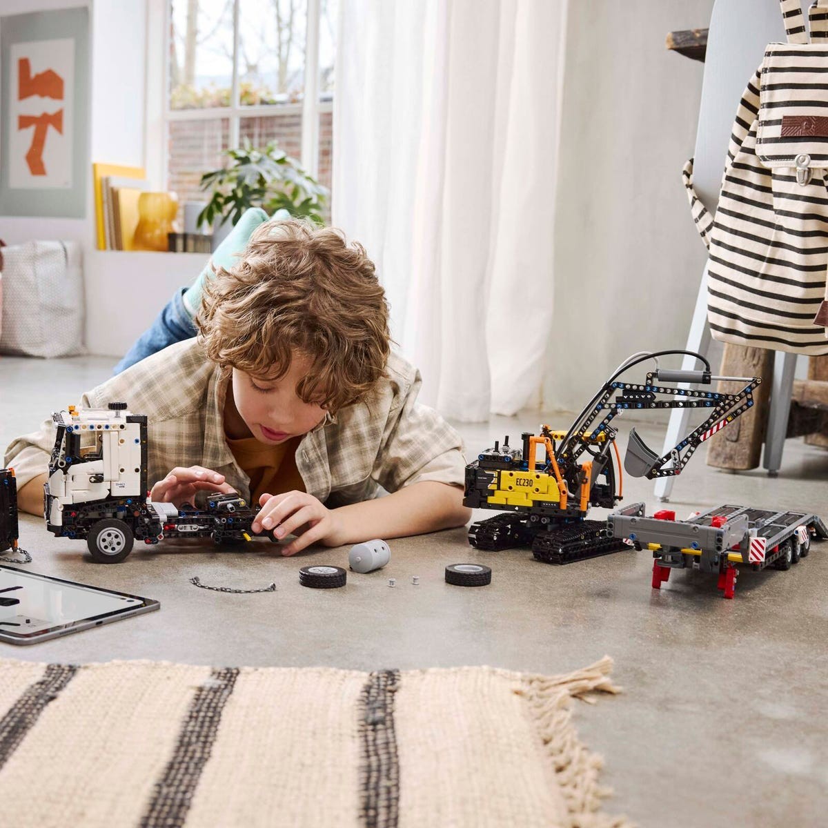 Setul LEGO® Technic Camionul FMX şi excavatorul electric EC230 de la Volvo (42175) include o remorcă platformă, excavator electric şi staţie de încărcare, oferind copiilor un proiect de construcţie captivant cu 2 modele detaliate de vehicule pentru explorare.