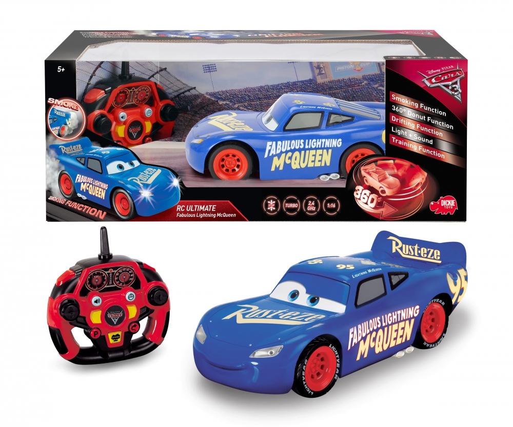 În noul film Cars 3, Lightning McQueen ramane la fel de agil, adormabil și plin de personalitate. Toate aceste caracteristici se găsesc și în mașina cu radiocomandă Ultimate Lightning McQueen de la Dickie Toys. Mașinuța vine cu un sistem radio pe 3 canale (2.4 Ghz) și cu o mulțime de funcții care să inspire la numeroase moduri de joacă. Pe lângă controlul de bază al direcției, funcția de turbo, acum mașina poate să facă drifturi și să se învârtă pe loc pentru a sărbători victoria. În timpul acestor manevre, roțile vor scoate fum la fel ca personajul din film, datorită unui rezervor cu apă. Iar dacă toate acestea nu sunt suficiente, să nu uităm și de funcția automată de parcare (mașina parchează automat la atingerea unui buton) și multe alte efecte sonore și luminoase.