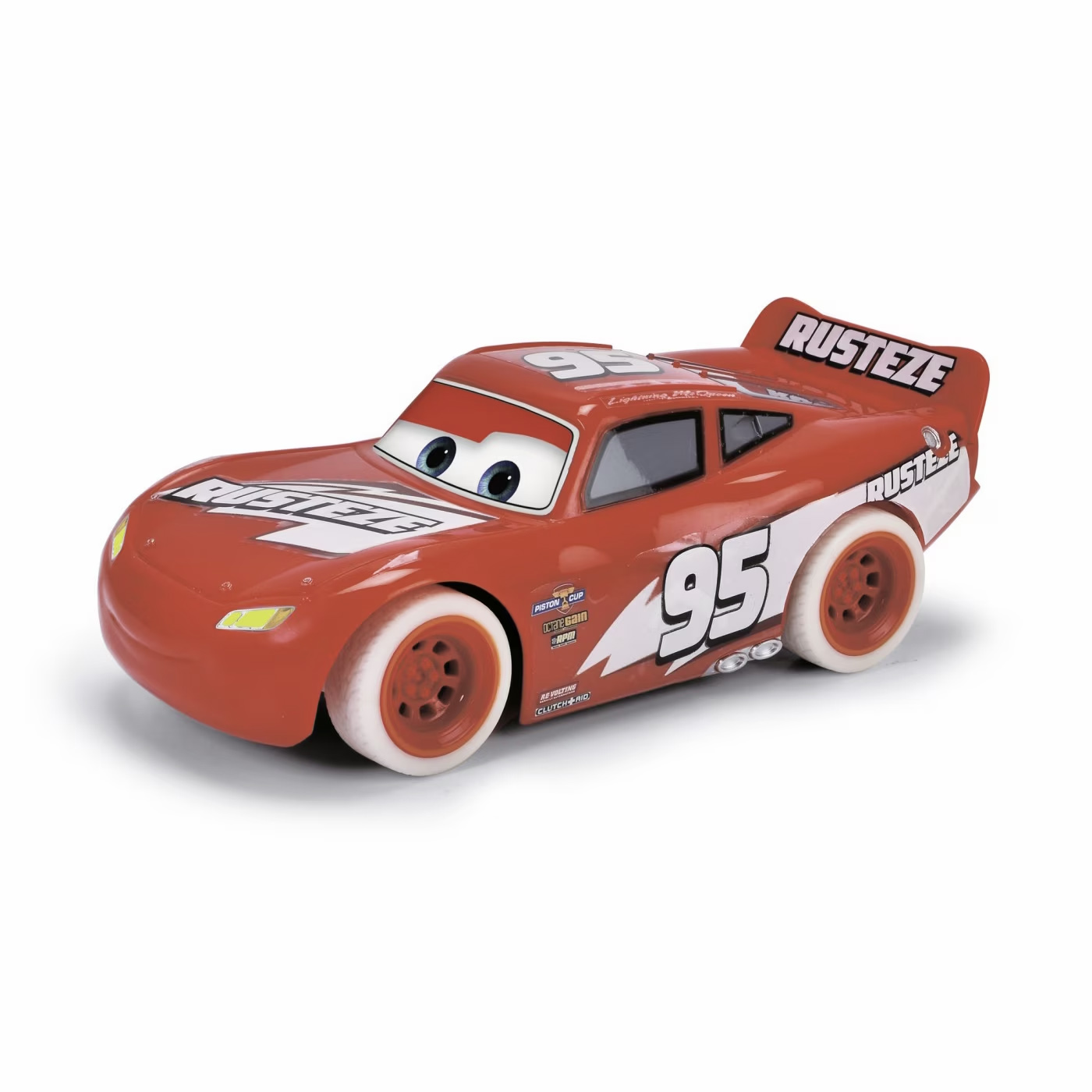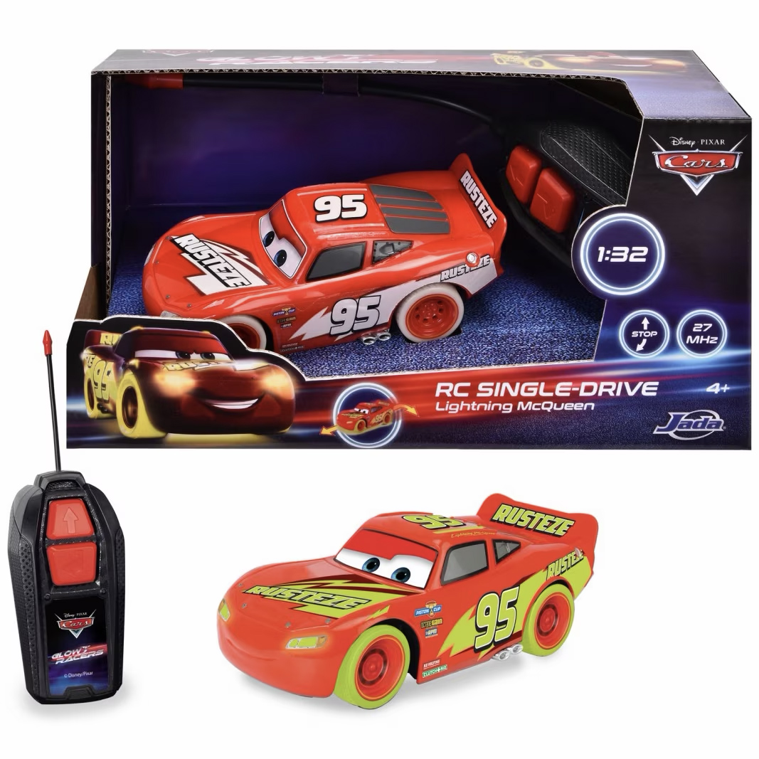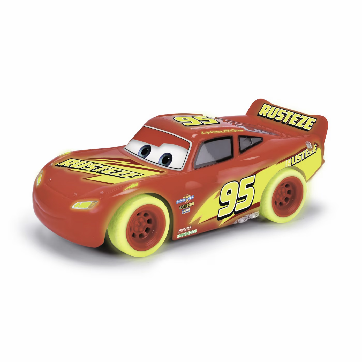 RC Turbo Racer Lightning McQueen (17 cm), straluceste in intuneric, masina de jucarie pentru copii cu telecomanda cu 2 canale (2,4 GHz), cu functie turbo. Masina are autocolante si anvelope care stralucesc in intuneric.
