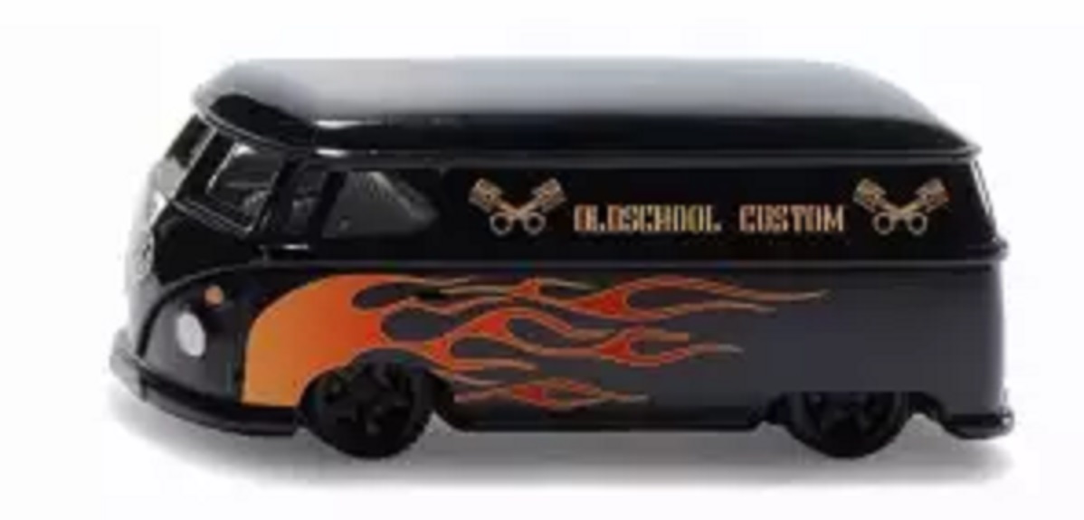 T1 de la Volkswagen este o legenda! Povestea de succes a microbuzului german a inceput in anii 1950, iar fanii sai germani il numesc cu drag „Bulli” de la "Bus und Lieferwagen", adica microbuz si masina de livrari. A fost un simbol al miracolului economic german si al miscarii hippie in SUA. Datorita designului sau rotunjit are o baza importanta de fani si astazi. Ca model Siku la scara 1:50 microbuzul cult VW T1 este disponibil si intr-o culoare speciala cu roti avand profilul "custom". Caroseria si usile sunt din metal, iar sasiul este din plastic. Doua usi laterale pot fi deschise pe partea dreapta a vehiculului. Cuplajul sau de remorca permite ca T1 sa poata tracta remorci. .