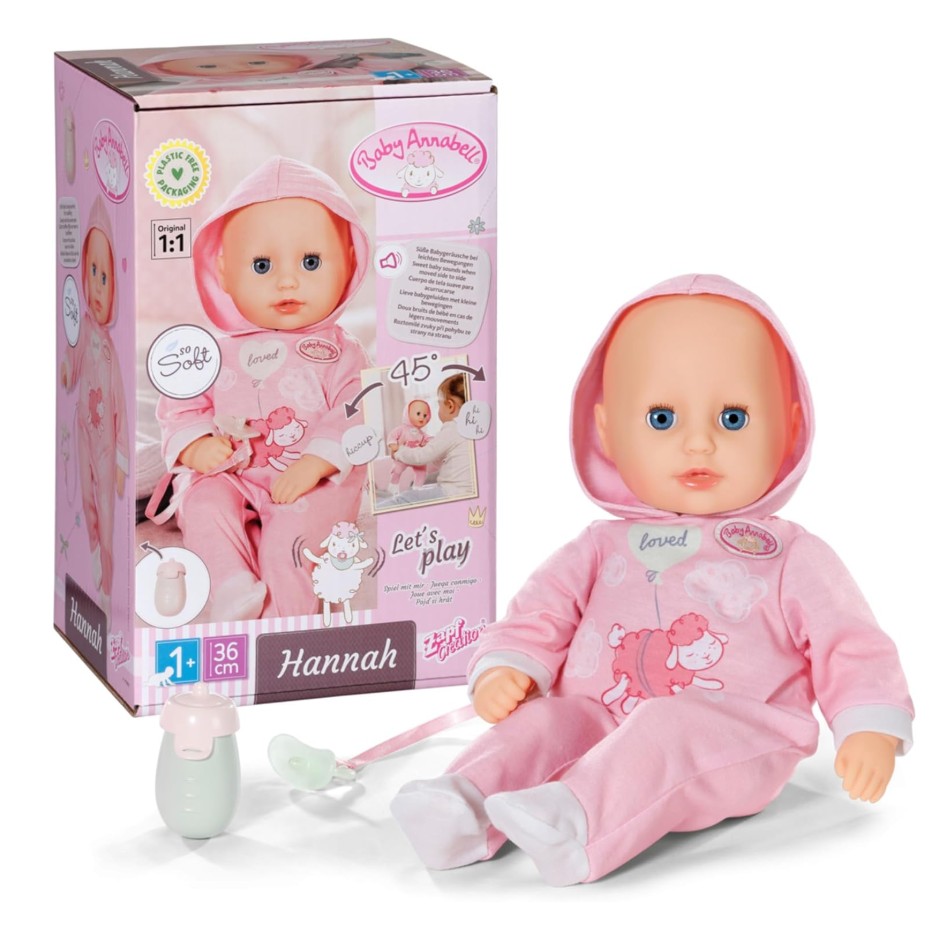 Papusa Baby Annabell Hannah este potrivita pentru copiii cu varsta de 1 an si peste, datorita corpului sau din tesatura moale si inaltimii de 36cm. Principiul de joc al Hannei este un joc de copii. Ea reactioneaza la fiecare miscare si interactiune: Daca ii tineti sticla la gura, face zgomote dragute de supt, daca ii apasati usor burtica, anunta cu un "yes" ca se simte bine. Daca o inclinati la stanga si la dreapta, face o mica balbaiala si rade vesel. Daca o puneti pe Hannah la somn dupa o joaca extinsa, isi inchide ochii, respira usor si in cele din urma adorme. Are cu ea sticla, suzeta si un salopeta casual cu gluga. Datorita manipularii usoare, dimensiunii mici a Hannei si principiului sau simplu de joc, chiar si cei mai mici copii pot avea grija de papusa lor.