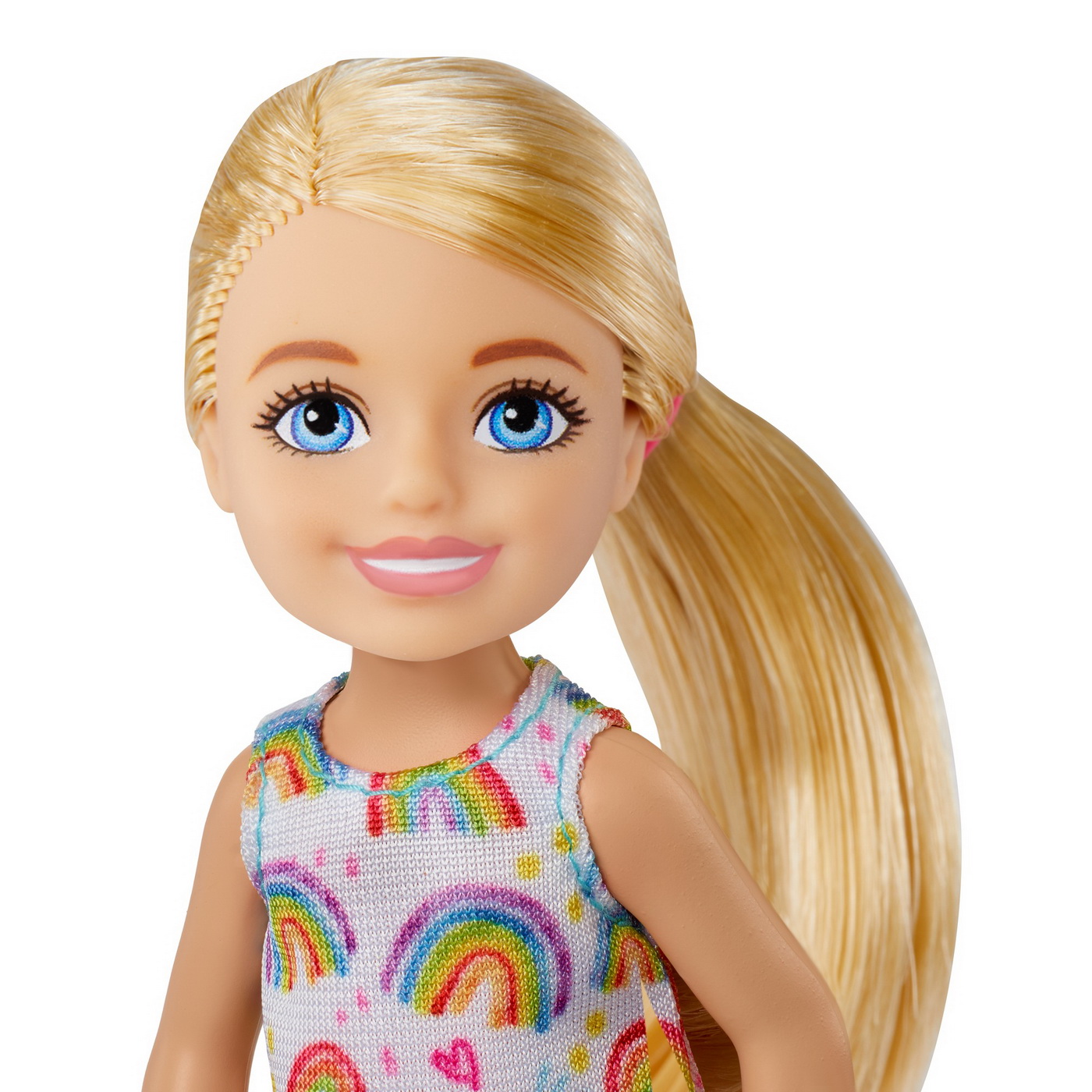 Papusile Barbie Chelsea vin cu pantofi si piese vestimentare detasabile. Creeaza povesti nenumarate cu scenarii diferite impreuna cu papusile Chelsea. Pentru scenarii creative achizitioneaza toate papusile Chelsea. Acest pachet contine o papusa Chelsea blonda, cu parul prin in coada, ce poarta o rochita cu imprimeu cu curcubeie iar in picioare are o pereche de sneakersi galbeni.