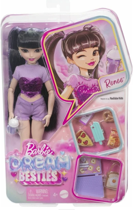 Papusa de moda are parul lung si negru, cu suvite mov stralucitoare, oferind oportunitati distractive pentru styling. Papusile Barbie Dream Besties inspira copiii de la 4 ani in sus sa viseze mare si sa isi urmeze pasiunile, transformandu-si visele in realitate!