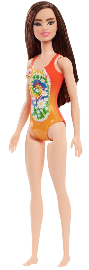 Acest pachet contine o papusa satena imbracata intr-un costum de baie portocaliu.