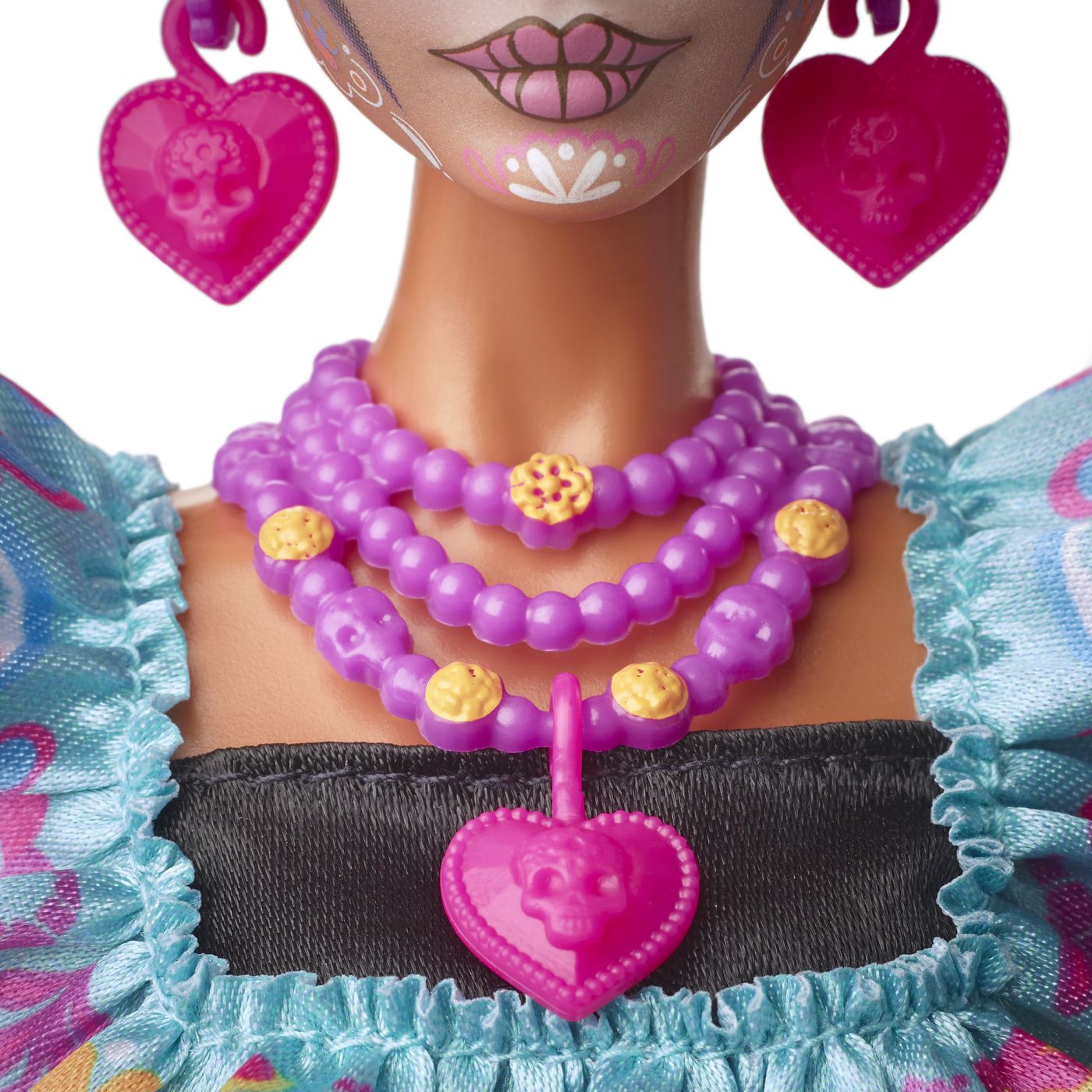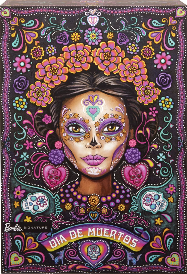 Papusa Barbie are un aspect luminos purtand o rochie lunga, neagra, cu volane, cu detalii complexe, colorate si cranii de zahar brodate.
