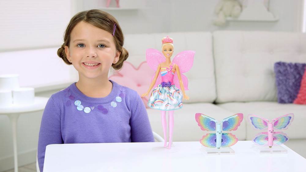 Imaginatia poate zbura - cu adevarat - cu aceste papusi frumoase Barbie cu aripi! Pentru ca atunci cand intri in Dreamtopia cu Barbie si Chelsea, te trezesti intr-o lume in care visele devin realitate! Aripile colorate prinse de clipsul din spatele papusii - au o forma de fluture. Cand sunteti gata, impingeti butonul in interiorul colierului si priviti-i aripile zburand in aer.
