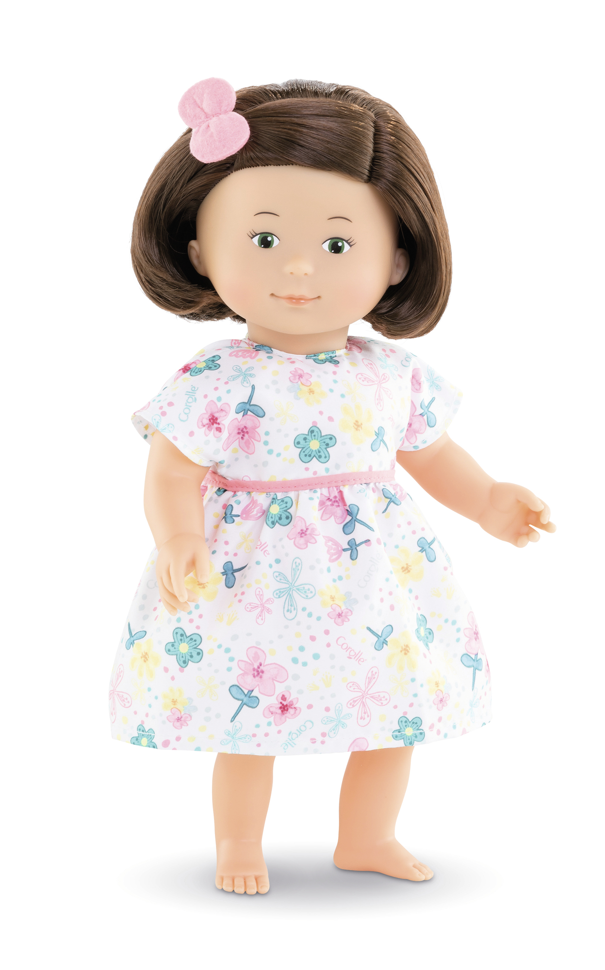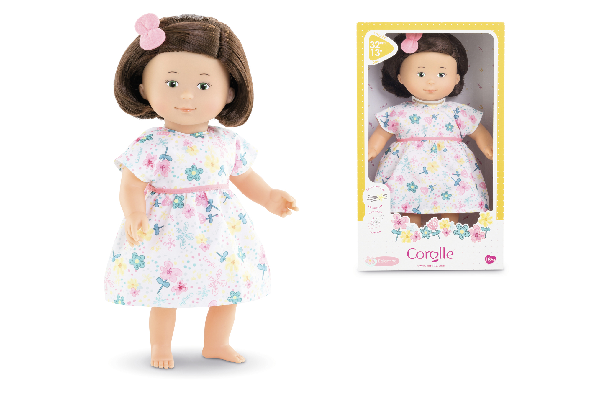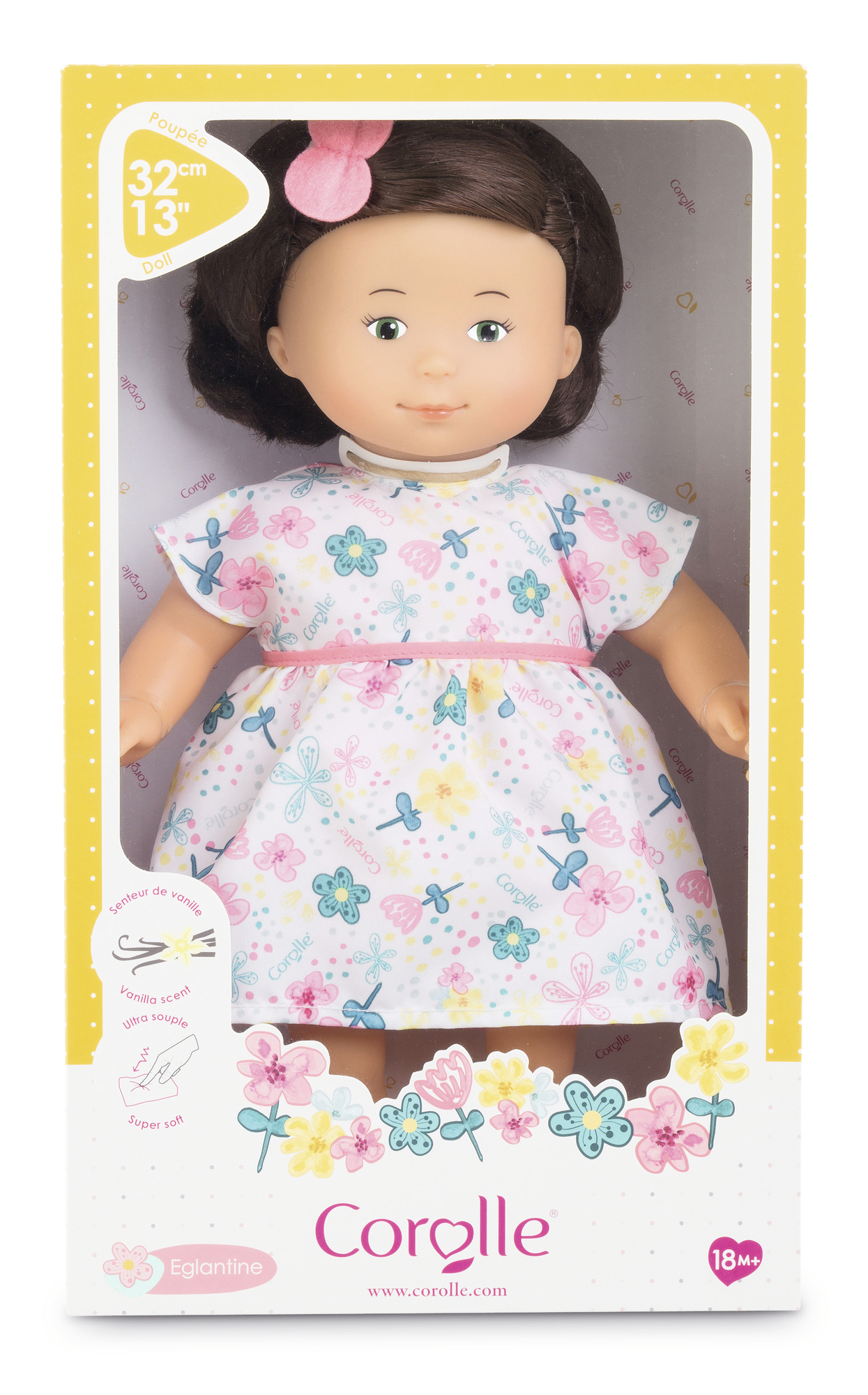 Florolle Eglantine este o papusa cu corp moale, cu inaltimea de 32 cm. Ea are parul matasos, coafat intr-un bob, o privire jucausa in ochii ei vopsiti in maro si un zambet vesel! Capul, bratele si picioarele ei sunt facute din vinil moale, suplu, care este delicat parfumat cu vanilie. Florolle Eglantine este Îmbracata intr-o rochie cu imprimeu floral .
