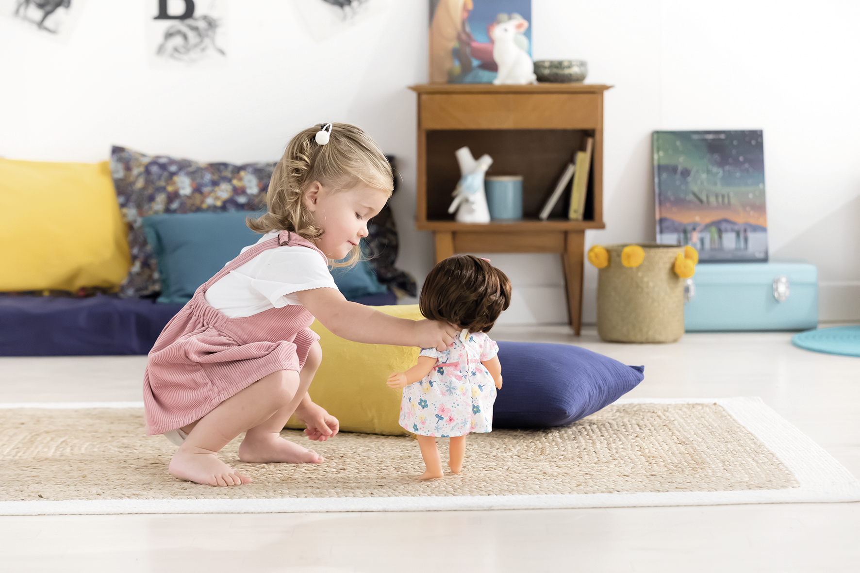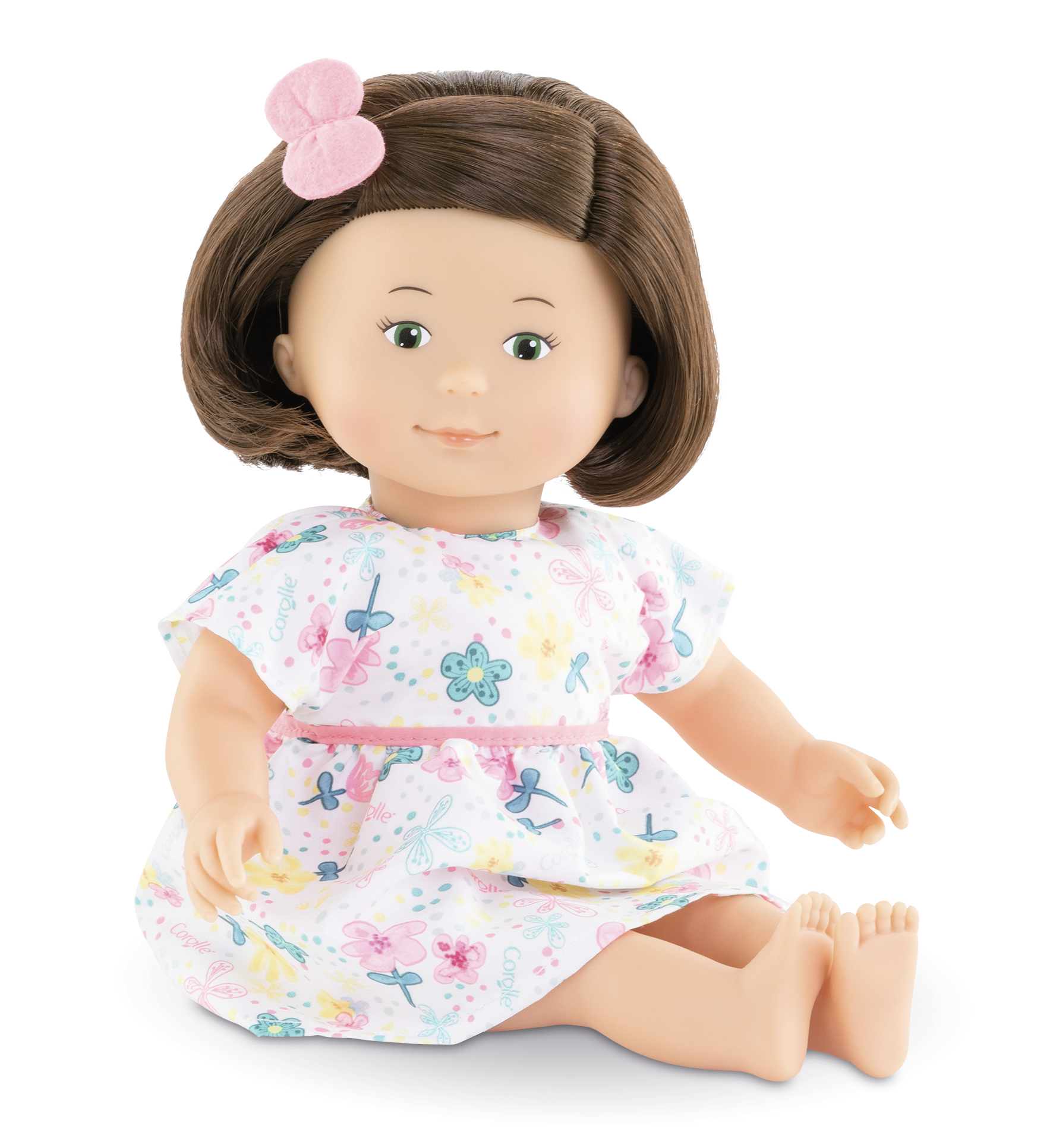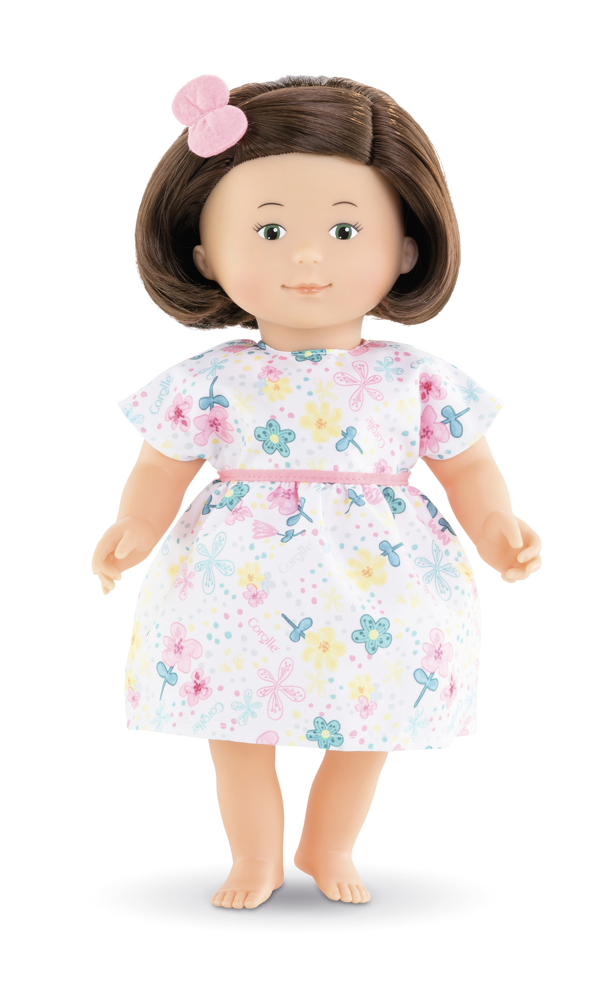 Florolle Eglantine este o papusa cu corp moale, cu inaltimea de 32 cm. Ea are parul matasos, coafat intr-un bob, o privire jucausa in ochii ei vopsiti in maro si un zambet vesel! Capul, bratele si picioarele ei sunt facute din vinil moale, suplu, care este delicat parfumat cu vanilie. Florolle Eglantine este Îmbracata intr-o rochie cu imprimeu floral .