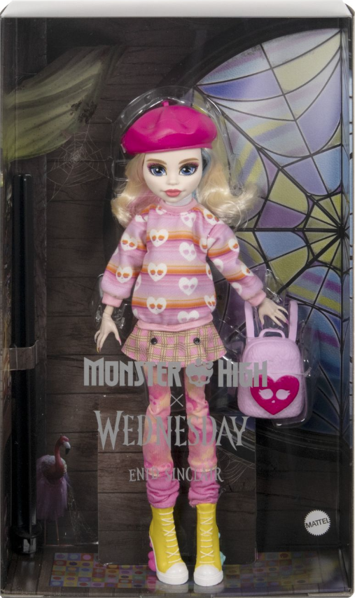 Aceasta papusa Enid Sinclair transforma colega de camera temperamentala si stilul ei vibrant prin obiectivul Monster High. Enid combina modele cu un pulover cu guler, o fusta in carouri, colanti marmorati si ciorapi.