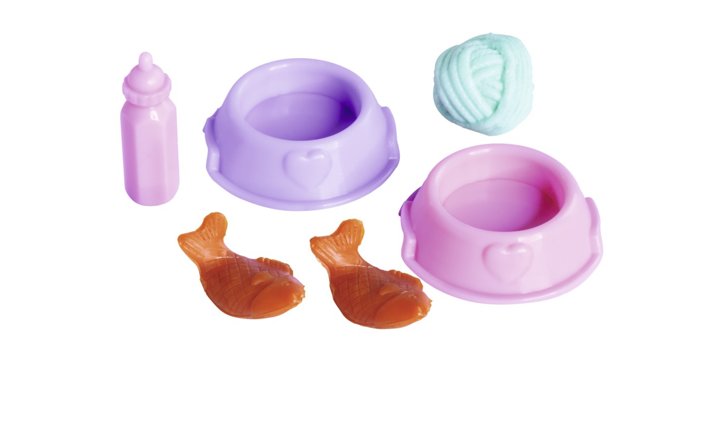 Pe langa papusa Steffi de 29 cm inaltime, setul include si accesorii de ingrijire si mancare.