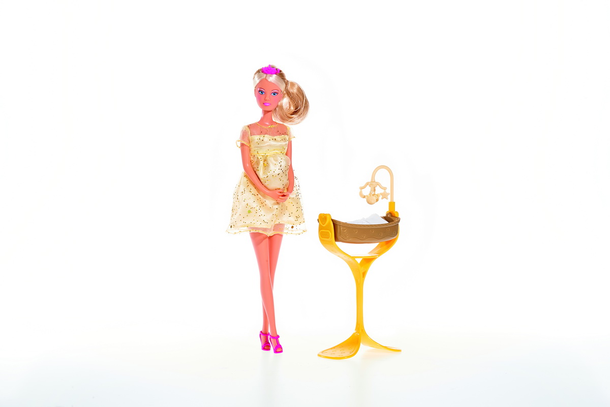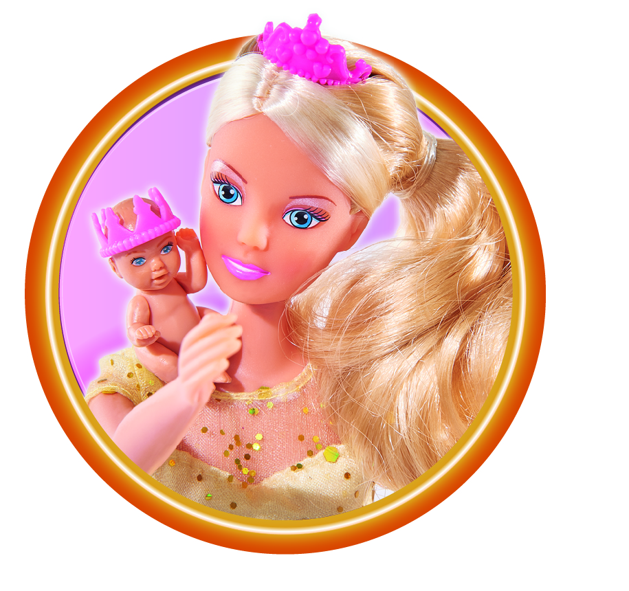 Printesa Steffi asteapta un copil. În tinuta ei regala, Steffi este foarte incantata sa descopere daca va pune un mic print sau o printesa in leaganul pentru bebelusii regali. Odata ce copilul este nascut, exista chiar o coroana regala pentru noua sosire. Papusa Steffi are o inaltime de 29 cm. Include papusa Steffi, copil, patut, perna, patura si coroana.