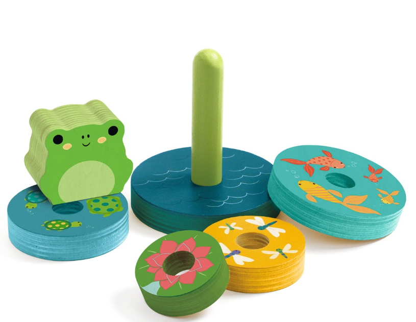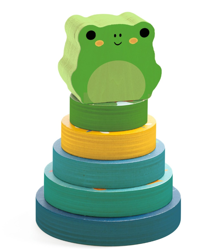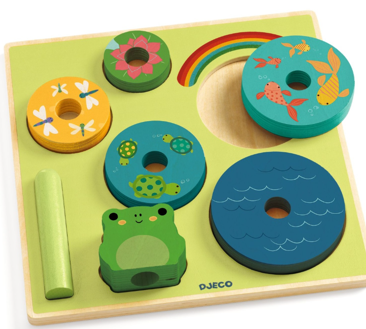 Puzz & Stack este un puzzle din lemn ușor de completat și un joc de stivuire. Piesele se stivuiesc pe axul de lemn pentru a forma o piramidă cu o broască zâmbitoare în vârf.