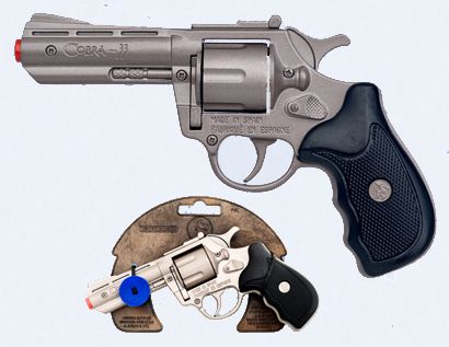 Pistolul este confectionat din metal de calitate, foarte rezistent. Are teava din metal de culoare gri. Functioneaza cu 8 capse pe disc.