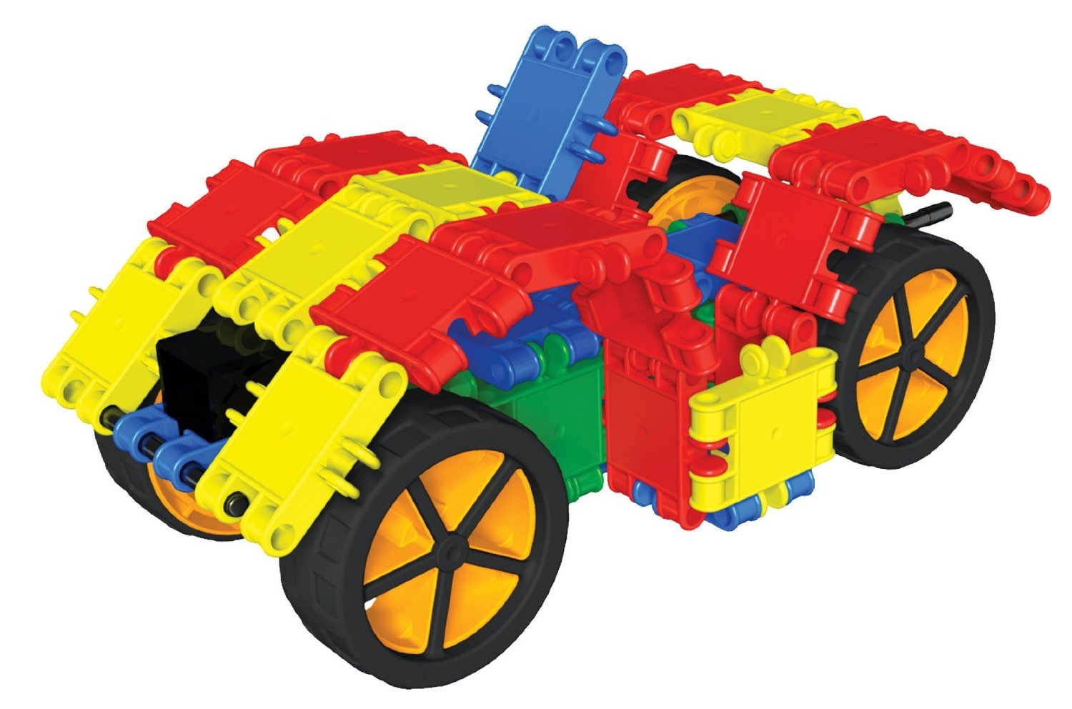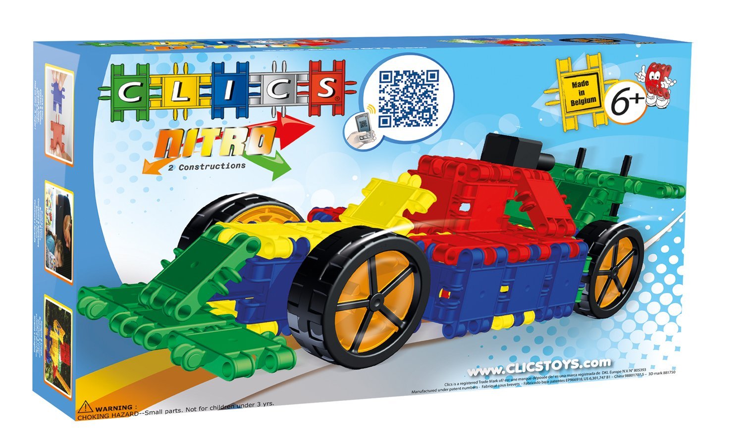 Clics Nitro ofera instrucțiuni pentru 2 modele, contine 62 piese Clics, 9 accesorii si 4 roti.