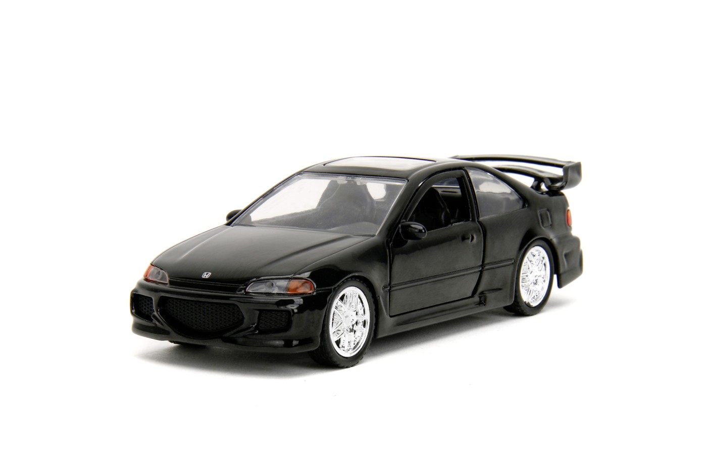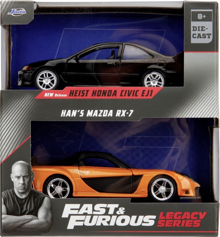 Pachet dublu la scară 1:32 de modele Fast & Furious. Conține Mazda RX-7 Veilside din 1997 de la Han în portocaliu/negru și Heist Honda Civic EJ1 în negru.