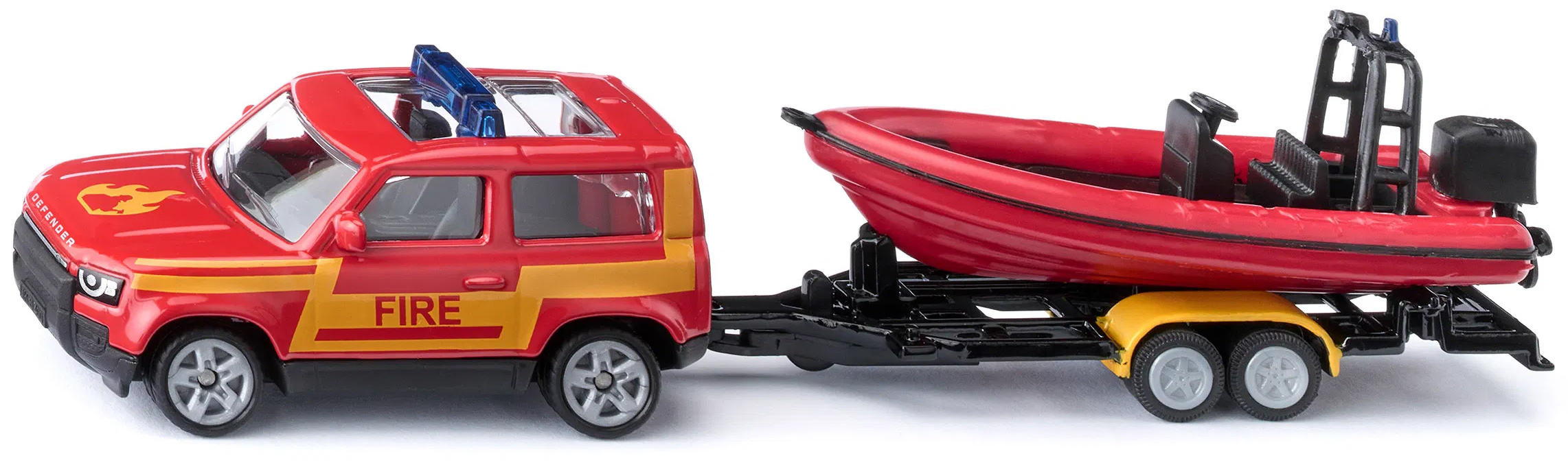 Datorită cârligului de remorcare integrat standard, Defender-ul tractează cu ușurință barca cu motor din plastic, inclusă în set, pe remorca cu cadru metalic, către următoarea destinație. Fie pe uscat, fie pe apă – cu acest set impresionant, nimic nu stă în calea unor misiuni de salvare palpitante!
