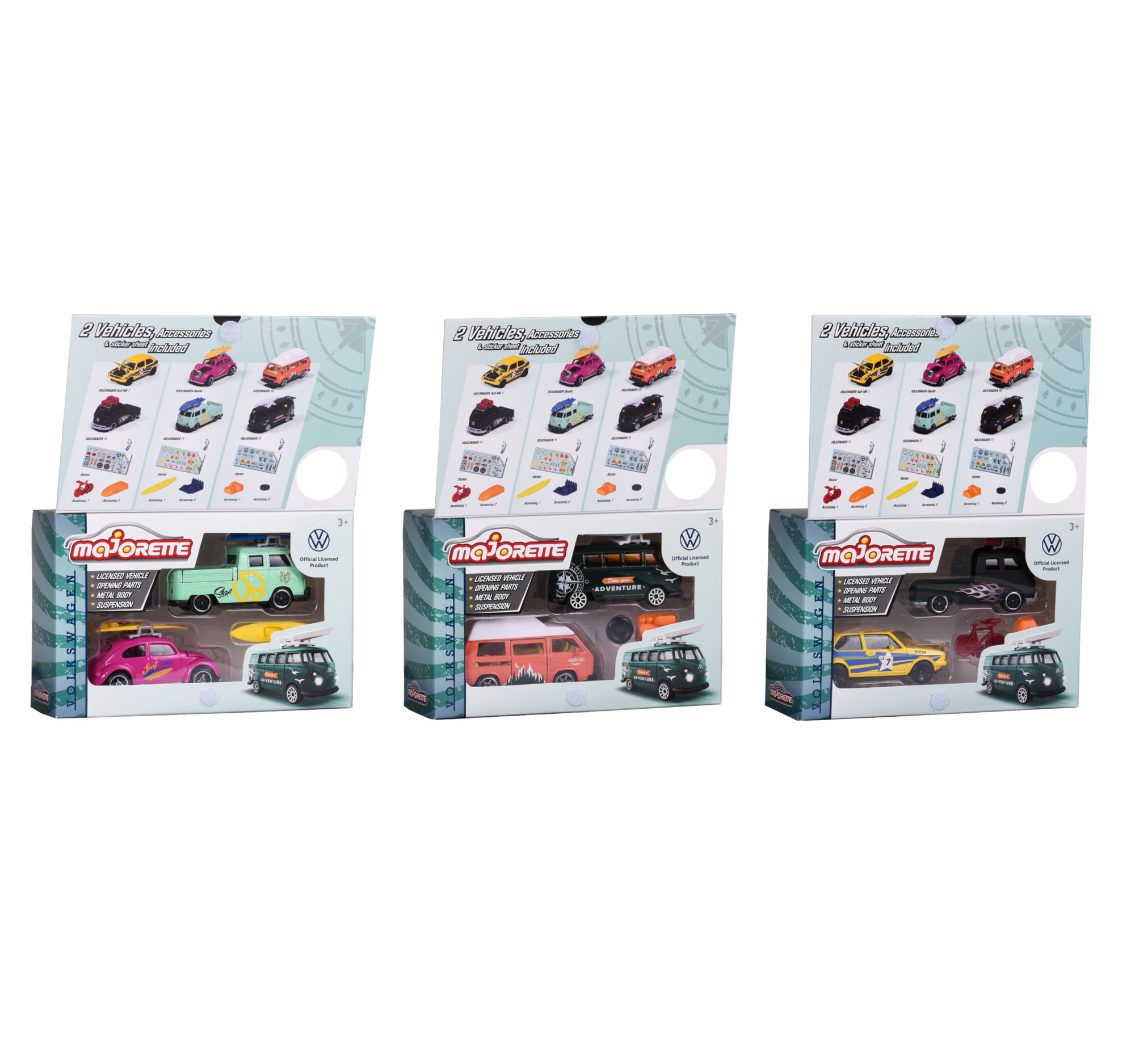 O adevarata echipa de vis – 2 vehicule VW sunt prezentate aici intr-un pachet dublu. Setul de masini Majorette contine pe langa cele doua masini de jucarie (fiecare aprox. 7,5 cm) o foaie de autocolante cu autocolante precum si accesorii individuale pentru masina.