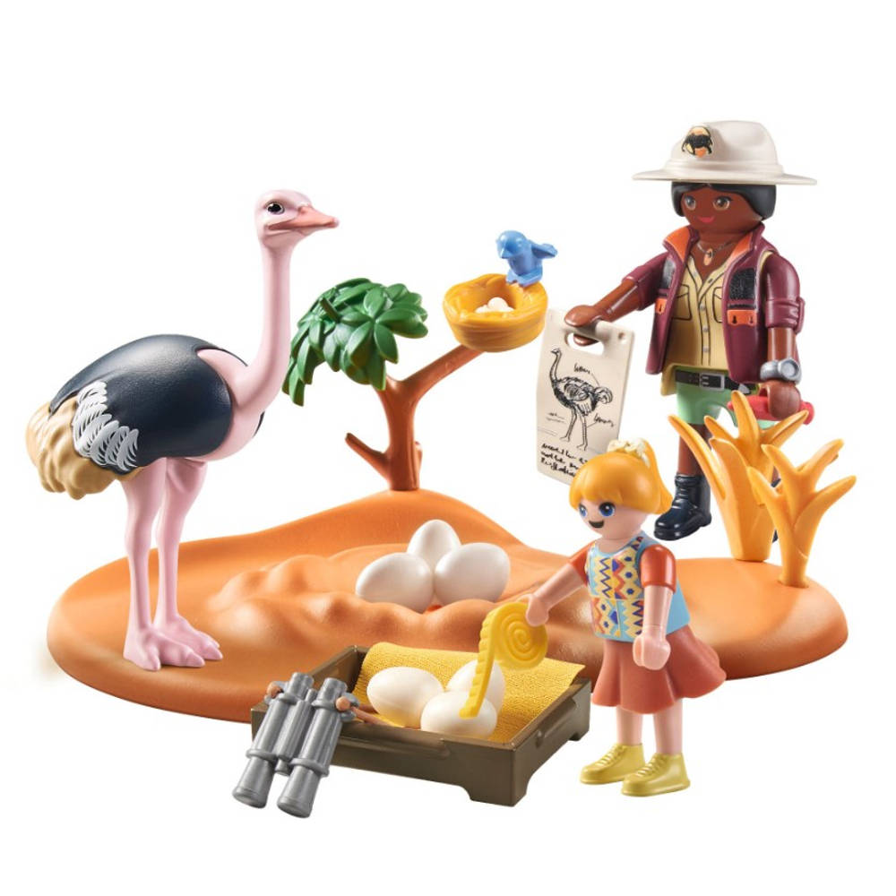 Set de joacă sustenabil WILTOPIA de la PLAYMOBIL cu un gardian de parc, un struț, două păsări, un cuib și alte accesorii.
