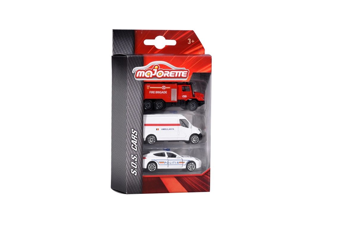 Set 3 mașinute S.O.S, din metal - poliție, pompieri și ambulanță.