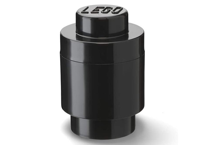 Set compus din 4 cutii de depozitare LEGO: 1 cutie rotunda 1x1 neagra, 1 cutie 1x1 gri deschis, 1 cutie 1x2 alba, 1 cutie 2x2 gri inchis.